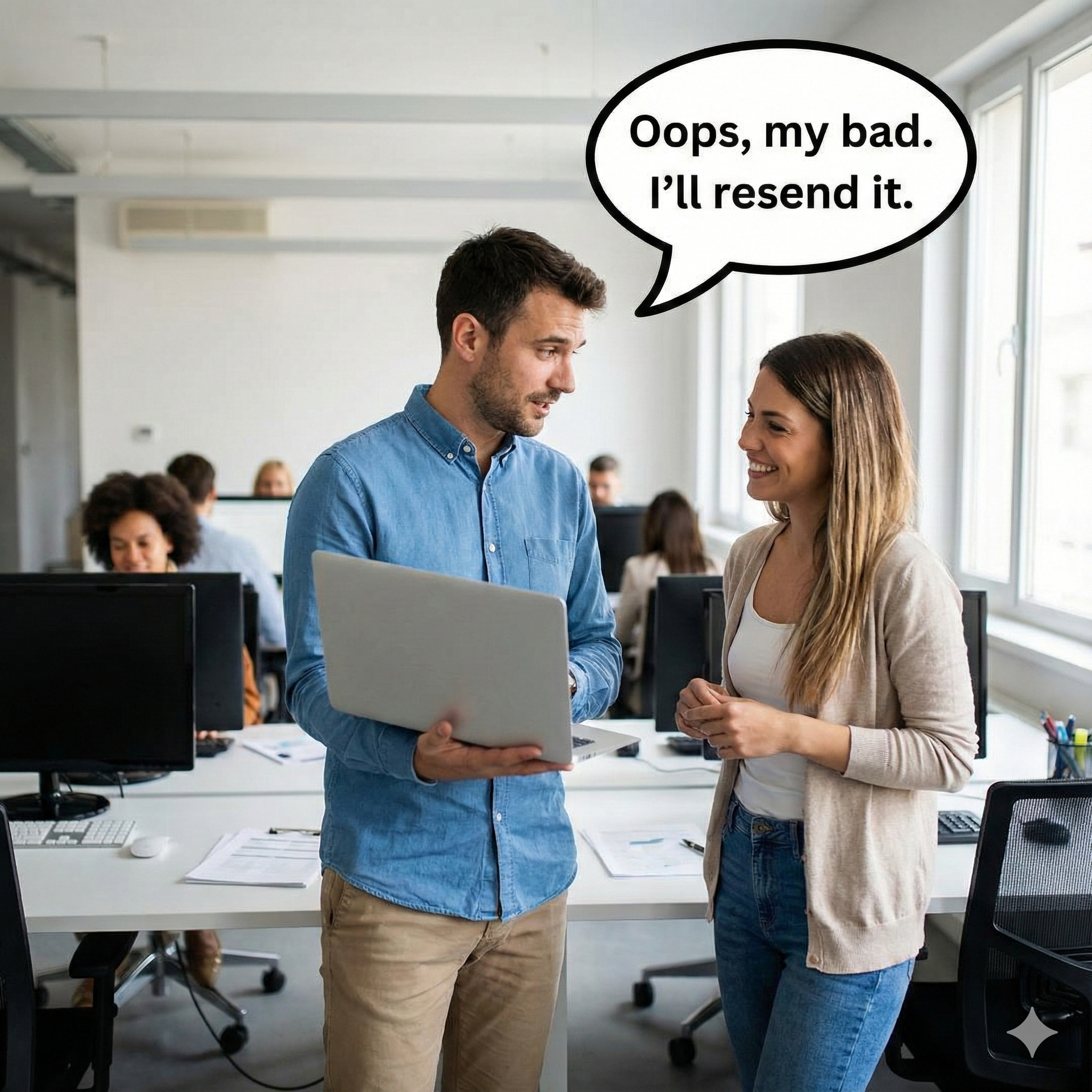 ![]() 제가 직접 써본 경험예전에 외국인 동료에게 회의 자료를 잘못 전달한 적이 있었어요.예전 같았으면 “I’m so sorry”를 연발했을 텐데, 그날은 용기 내서 “Oops, my bad. I’ll resend it.” 이라고 말했어요. 그랬더니 동료가 웃으면서 “No worries!” 라고 답하더라고요. 그때 느꼈어요. 아, My bad는 실수를 인정하면서도 분위기를 망치지 않는 표현이구나 하고요. ![]() 사용 시 주의할 점물론 My bad는 모든 상황에서 쓰면 안 돼요.중요한 비즈니스 실수나 공식적인 사과가 필요한 상황에서는 “I apologize”나 “I’m sorry for the mistake”가 더 적절해요. 정리하면,