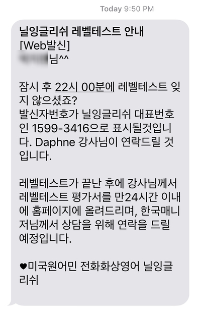 하와이 여행을 다녀온 후로 나름의 목표가 생겨 영어공부를 열심히 해야 겠다는 의지가 불끈불끈 ! 평소엔 나태하다가도 목표가 생기면 돌진하는 성격이라 한국에 도착한 다음날부터 정보 검색을 시작했다 회사에서 국제업무를 맡고 있어 매일 영어를 쓰지만 대부분 읽기와 쓰기에 치중되어 있기에 말을 할 기회가 거의 없어서 고등학교 때 잠깐 했던 전화영어를 이용해 보기로 했다. 당시의 전화영어는 교재가 있어서 미리 공부를 하고 그 부분에 대해 선생님과 얘기를 하는 방식이었는데 직장인이다보니 미리 공부를 해야 하는 시스템은 힘들 것 같아 편한게 대화하듯 이야기하는 프로그램을 찾았다 미국 원어민 전화영어 닐잉글리쉬 (NIL English) 먼저 나의 실력이 어느 정도인지 알아야 하니 홈페이지에서 레벨테스트 신청 - 주말은 테스트 불가라서 평일로 신청해야 했는데 다행히 밤 늦은 시간까지 오픈되어 있어 편한 시간으로 신청 고고 !! ![]() 신청과 동시에 팝업창으로 안내메세직가 떳고 일부러 회원가입을 할 필요가 없다는 게 너무너무 좋았다 :D 물론 회원가입을 먼저 진행해도 되지만 솔직히 회원가입 겁나 귀찮잖아유 .... ![]() 레벨테스트 예약완료 확인을 했더니 카톡과 문자로 안내 매세지가 다시 한번 발송 - 카톡 매세지에는 문의 전화번호도 함께 안내 되었는데 레벨테스트 신청기간 때문인지 밤 7시 - 11시 가능이라 넘나 부담없구여 ㅋㅋㅋㅋ ![]() 그렇게 며칠이 지나고 레벨테스트 날. 테스트 10분 전에 리마인더 메세지를 받았고 강사님이 누구인지도 확인할 수 있었다. 약속대로 10시에 레벨테스트 전화를 받았지만 먹통처럼 아무 소리도 들리지 않아 끊기를 여러번 Hello 만 몇 십번 반복하다 결국 카톡에 안내된 번호로 전화를 했다. ( 전화 핵 빨리 받아서 깜놀) 문제에 대해 얘기를 했더니 선생님과 바로 확인을 해주었고 몇 분 후에 정상적으로 레벨테스트를 진행했다. 물론 전혀 문제가 생기지 않으면 좋겠지만 어떤 일이든 예상치 못한 문제는 생길 수 있기 때문에 문제가 발생했을 때 어떻게 대처하는지가 더 중요하다고 생각한다. ( 이것이 사회생활의 교훈인가.... 또르르....) 고객센터 번호를 미리 받았고 연결도 빨리 된데다 처리도 금방 이루어져서 이 부분에 정말 높은 점수를 주고 싶다. 나와 통화한 선생님은 다정한 옆집 이웃 같은 느낌이었고 꽤 오래 학생들을 가르친 분이었다. 왜 영어 공부를 하는지, 나는 어떤 사람인지에 대한 얘기 등을 했는데 계속 잘한다고 칭찬도 해 주시고 특징도 얘기해주셔서 정말 즐겁게 통화를 하고 끊었다. ![]() 레벨테스트 후 24시간 내에 리포트가 올라온다고 들어서 메세지를 받을 것 같았지만 그 전에 홈페이지 들락날락 ㅋㅋㅋㅋ ( 급한 한국인 성격 어쩔 ㅋㅋㅋㅋ) 예상대로 카톡과 문자로 테스트 평가서 업데이트 안내가 왔고 두근대는 마음으로 로그인 샤샥 - ![]() ![]() 리포트는 부분별 점수와 평균 점수, 레벨평가서로 이루어져 있었다. 내 예상 보다 좀 더 높은 Advanced-low 등급을 받았고 역시나 내가 부족하다고 생각한 Grammar 가 ... 어흑 레벨평가서에는 각 파트에 대해 어떤 부분이 좋고 부족한지 자세하게 써 있어서 공부방향을 설정하는데 도움이 많이 될 것 같다. ( corrections는 나의 사적인 얘기가 있어서 블러처리 헤헤 ) 앞으로 4주간 어떻게 도움이 되었고 얼마나 발전이 될지 기록해 봐야지. * 닐잉글리쉬 서포터즈 4기 체험 후기입니다. < 출처 : https://aroundmidnight.blog.me/221481243770 > |