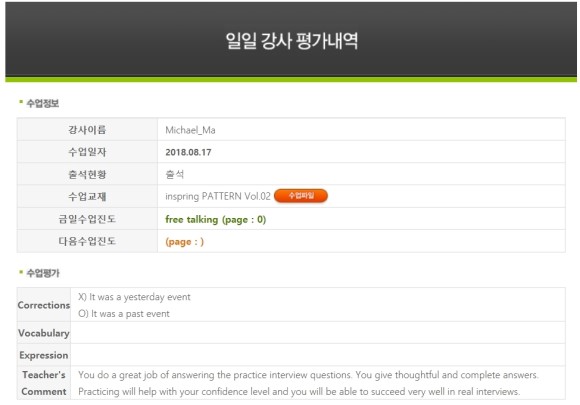 저번주에 광복절 휴강이 있어서 두번 수업을 진행했는데 정말루 감사한 시간이었어요. 마이클 쌤은 현지 시간으로 새벽 5시에 저와의 수업을 시작으로 하루를 맞이 하신대요 새벽 5시라니 정말 대단하신것 같아요 ㅜㅜ 아침에 비몽사몽 피곤하실수 있을텐데 수업이 집중하고, 저에게 집중 하고 계심이 팍팍 느껴 진답니다 그 날 컨디션과 저의 스피킹 상태에 따라 난이도 조절(?)도 하고 계시는 느낌이 듭니다 ^^ 이번주는 인터뷰를 대비한 질문들도 해 주셨어요 실제 인터뷰였다면 당황해서 어버버 했을 것을 저를 충분히 알고 있는 친구와 의견을 나누는 느낌이 드니까 마음 편하게 제 생각을 말 할 수 있었어요. 마이클 쌤이 남겨주신 피드백 공유해 보겠습니다. ![]() 이 날은 다행히 corrections란에 하나 밖에 없네요. 다른 날은 많거든요 ^^ Teacher's comment에 코멘트 보이시나요? 마이클 쌤 진짜 든든 합니다. 닐잉글리쉬에서 철저하게 선생님들과 교육을 관리하고 있기 때문에 이렇게 안정적으로 학생들을 위한 수업이 진행되는 것 아닐까 싶어요 닐잉글리쉬 전화화상영어 알게 되었을때 한국인 매니저분과 영상통화도 하고 카톡도 주고 받았었는데 양질의 교육을 제공하기 위해 노력하시는구나 느낄수 있었죠 매일 수업을 하니 처음엔 조금 힘들었는데 루틴으로 자리잡혀 가니 좋습니다. 열의를 가지고 매 수업에 임하고 있습니다. |