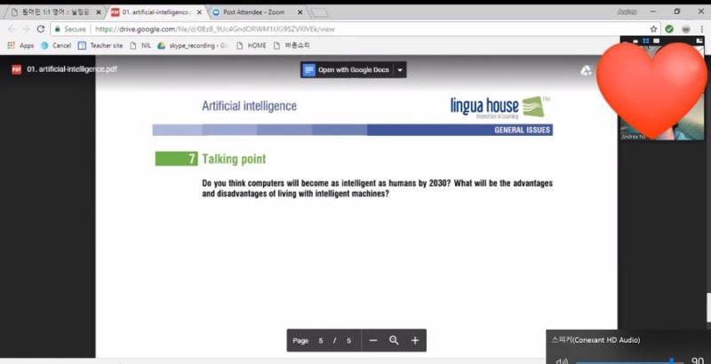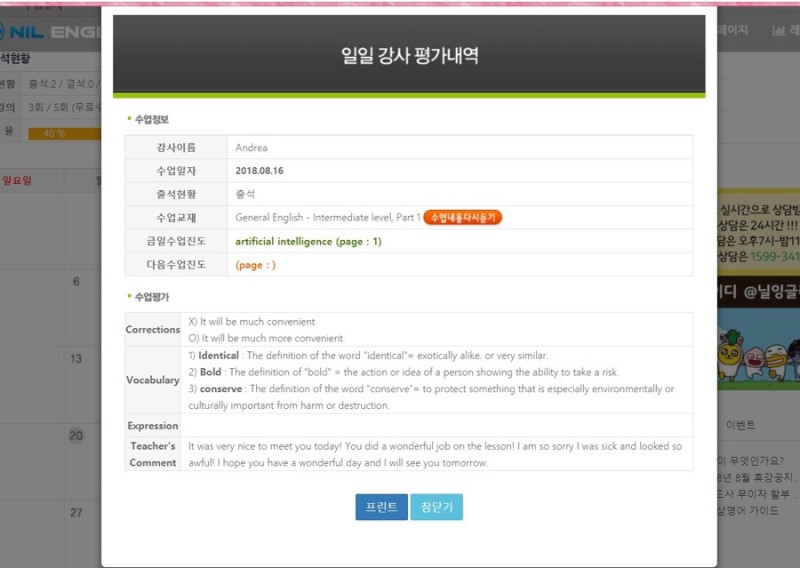 레벨테스트 한 후에 일주일 동안 화상영어 수강한 후기를 적어 보려 합니다. 닐잉글리쉬는 여러 수업들을 진행하고 있는데, 저는 매일 10분 동안 하는 화상영어를 신청했어요. 전화보다는 화상으로 하는 게 뭔가 직접 외국인을 만나는 느낌을 받을 것 같아서 이걸로 신청했습니다 ![]() 저의 화상 영어 선생님은 위의 그림에 손가락 표시가 되어 있는 Andrea teacher !!! 근무시간대 별로 어떤 선생님께서 수업해 주시는지 알 수 있어요 ! 홈페이지에 들어가면 정말 자세한 정보들 얻을 수 있답니다 매일 1시 30분에 화상으로 Andrea 선생님과 수업을 진행했어요. ![]() 이렇게 수업 교재를 띄워 놓고 수업을 진행합니다 원래는 10분 수업인데 이야기를 하다 보면 10분이 넘을 때가 대부분이더라구요 10분이 늘 짧게 느껴집니다 ! Andrea 선생님은 공감을 잘 해 주시고 칭찬도!!! 진짜 아무것도 안했는데 막 엑설런트 ~~~ ^^ 이러시니까 자신감을 가지고 부담 없이 말할 수 있어서 정말 좋습니다 ![]() 수업이 끝나면 이렇게 짧은 평가지를 작성해 주시는데 선생님과 사실 화상으로 많이 이야기를 하는 편이기 때문에 이렇게 짧게 작성해 주시는 것 같아요! 이 부분은 선생님들 마다 다른것 같습니다. 1주차 후기를 정리 하자면 화상영어로 수업을 신청하기는 했지만 , 사실 어떻게 말해야 하지 하고 쫄아 있었는데 선생님께서 편하게 수업해 주셔서 자신감을 가지고 수업할 수 있었던 것 같아요. 수업을 받는 다는 느낌보다는 자연스럽게 말하는 법을 배우는 것 같아서 좋습니다 제가 영어 말하기엔 자신감이 없었는데 하루에 10분 이상씩 말하기 연습을 하다 보니 자신감은 확실히 느는 것 같아요 수업할때가 기다려 집니다!!! |