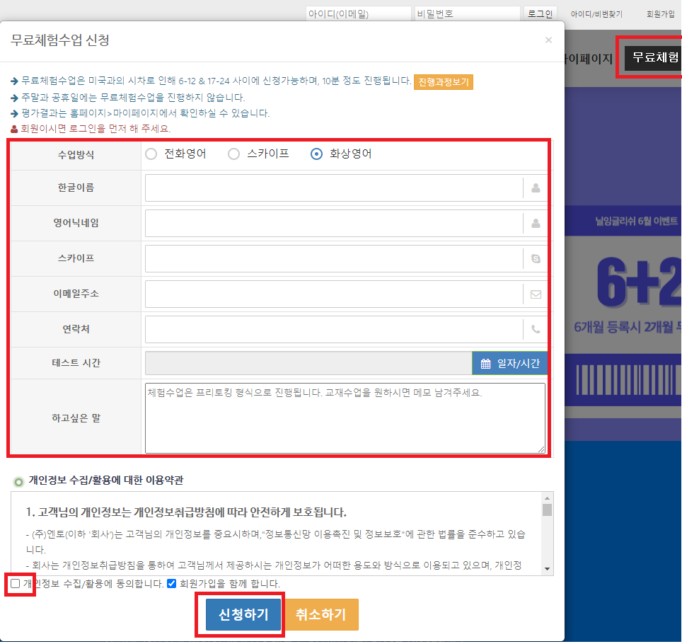무료체험수업을 신청하실 때 기본적으로 "회원가입을 함께 합니다" 란이 체크되어있어 체험수업 신청시에 자동으로 회원가입이 됩니다.